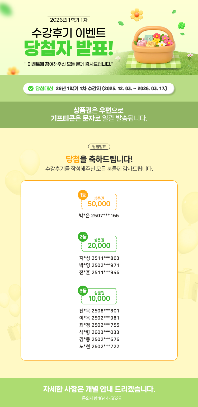 [¹ßÇ¥] 2026³â 1Çбâ(1Â÷) ¼ö°Èıâ À̺¥Æ® ´ç÷ÀÚ ¹ßÇ¥!!