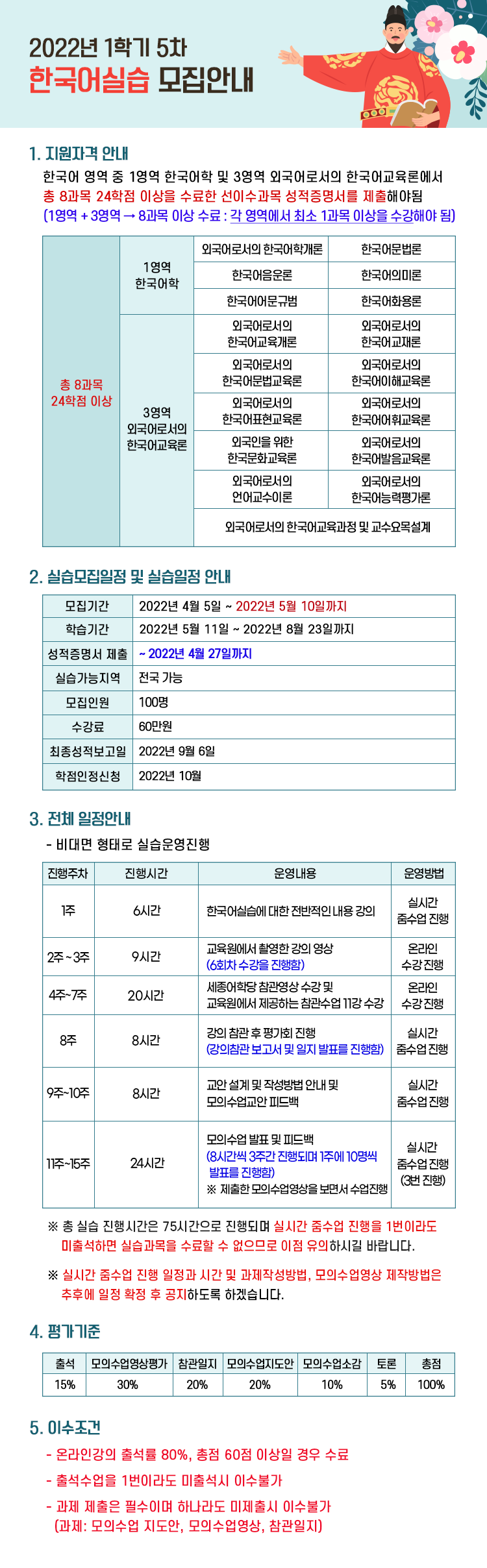 [¾È³»] 2022³â 1Çбâ 5Â÷ Çѱ¹¾î½Ç½À ¸ðÁý ¾È³»ÀÔ´Ï´Ù.