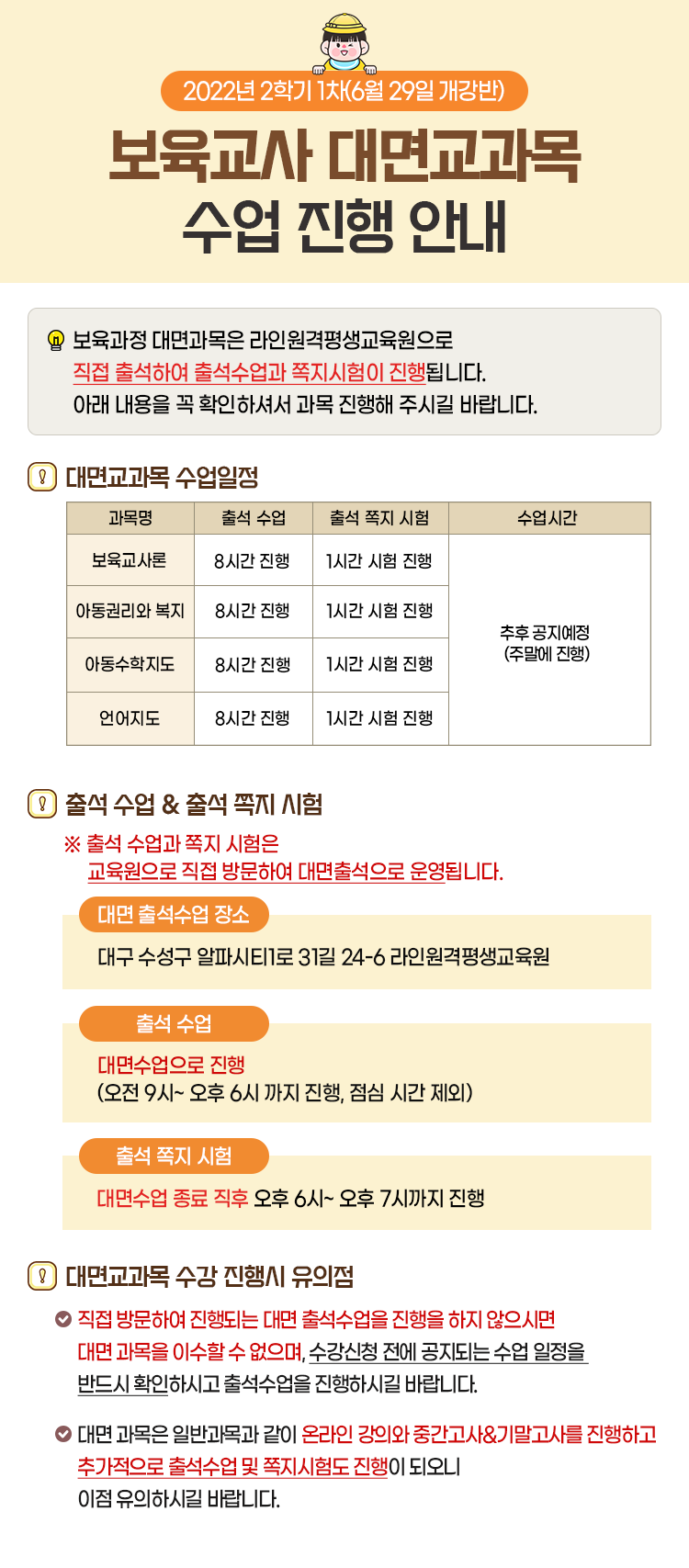 [¾È³»] 2022³â 2Çбâ 1Â÷ º¸À°±³»ç ´ë¸é±³°ú¸ñ ¼ö¾÷ÁøÇà ¾È³»ÀÔ´Ï´Ù.