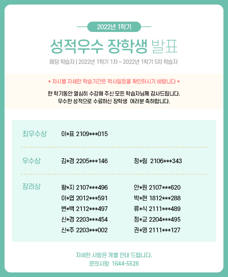 [¹ßÇ¥] 2022³â 1Çб⠼ºÀû¿ì¼ö ÀåÇлý ¹ßÇ¥!!