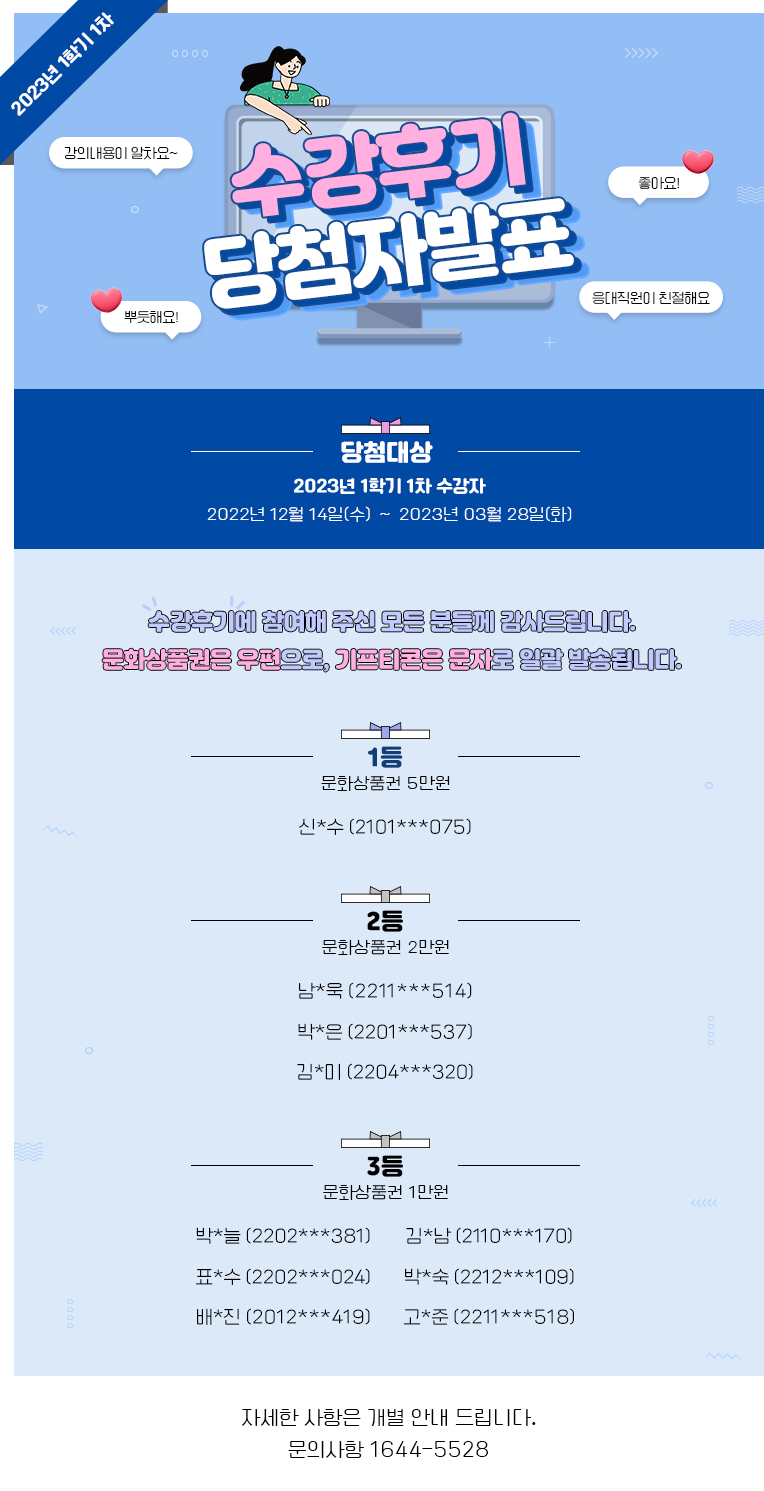 [¹ßÇ¥] 2023³â 1Çбâ(1Â÷) ¼ö°Èıâ À̺¥Æ® ´ç÷ÀÚ ¹ßÇ¥!!