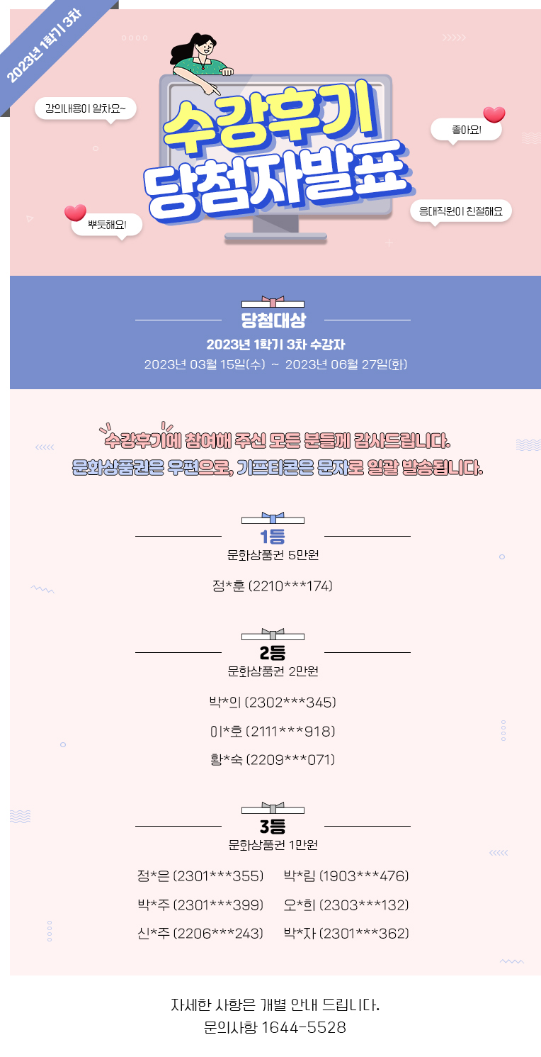 [¹ßÇ¥] 2023³â 1Çбâ(3Â÷) ¼ö°Èıâ À̺¥Æ® ´ç÷ÀÚ ¹ßÇ¥!!