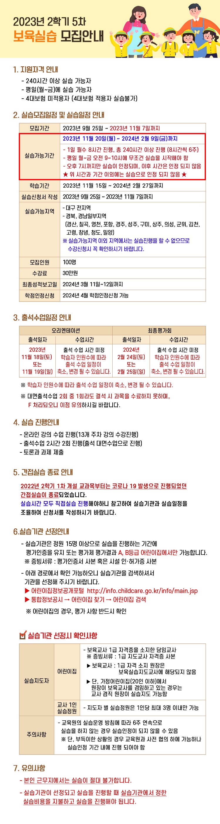 [¾È³»] 2023³â 2Çбâ 5Â÷ º¸À°½Ç½À ¸ðÁý ¾È³»ÀÔ´Ï´Ù.