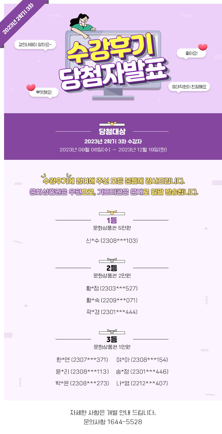 [¹ßÇ¥] 2023³â 2Çбâ(3Â÷) ¼ö°Èıâ À̺¥Æ® ´ç÷ÀÚ ¹ßÇ¥!!