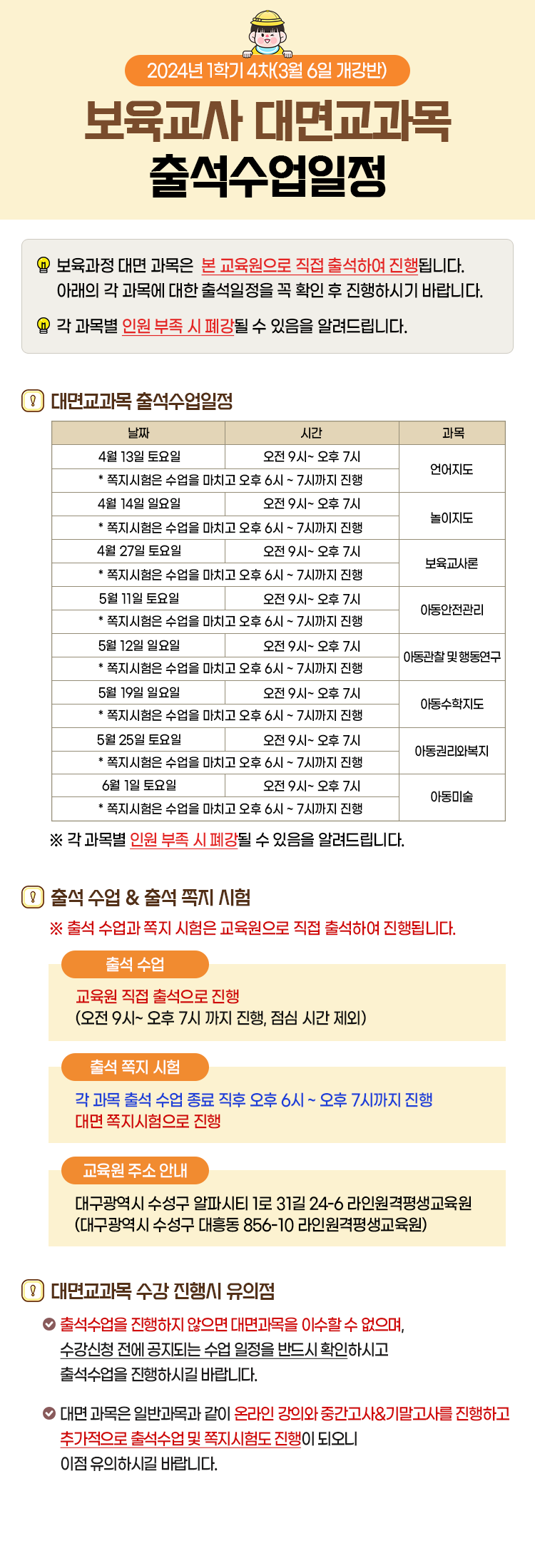 [2024³â 1Çбâ 4Â÷] º¸À°´ë¸é Ãâ¼®¼ö¾÷ÀÏÁ¤ ¾È³»ÀÔ´Ï´Ù.