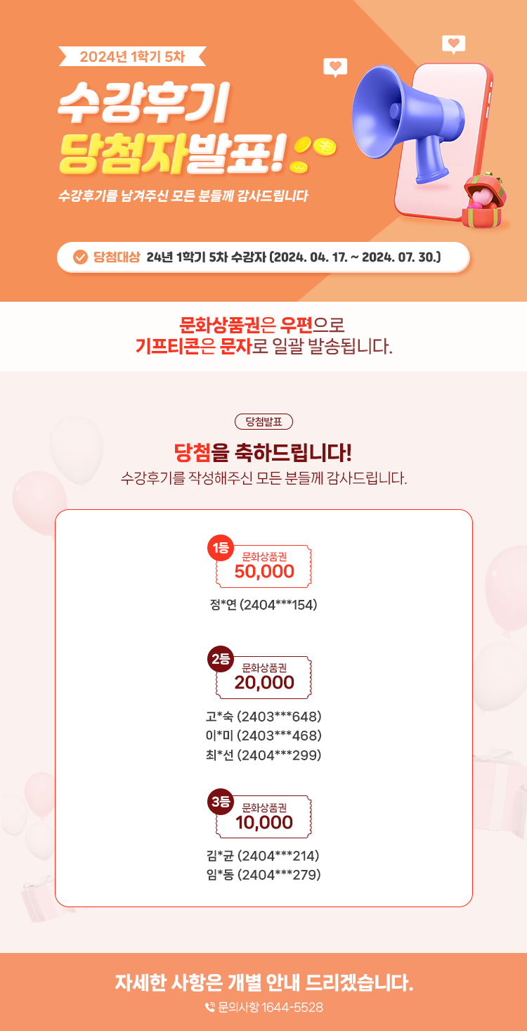 [¹ßÇ¥] 2024³â 1Çбâ(5Â÷) ¼ö°Èıâ À̺¥Æ® ´ç÷ÀÚ ¹ßÇ¥!!
