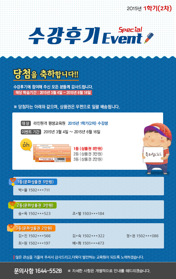 [¹ßÇ¥]2015³â 1Çбâ(2Â÷) ¼ö°Èıâ À̺¥Æ® ´ç÷ÀÚ ¹ßÇ¥!!