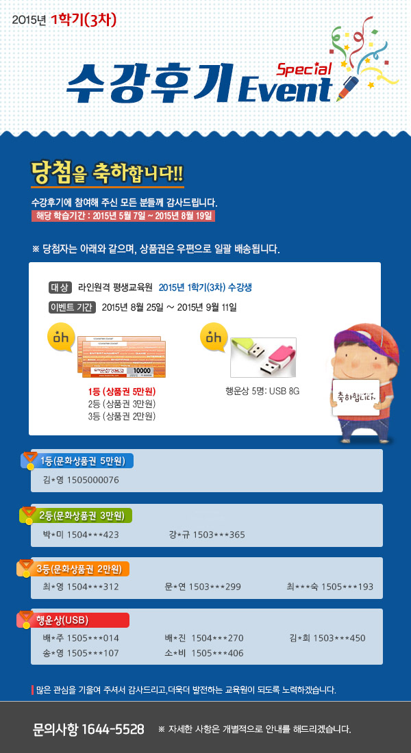 [¹ßÇ¥]2015³â 1Çбâ(3Â÷) ¼ö°Èıâ À̺¥Æ® ´ç÷ÀÚ ¹ßÇ¥!!