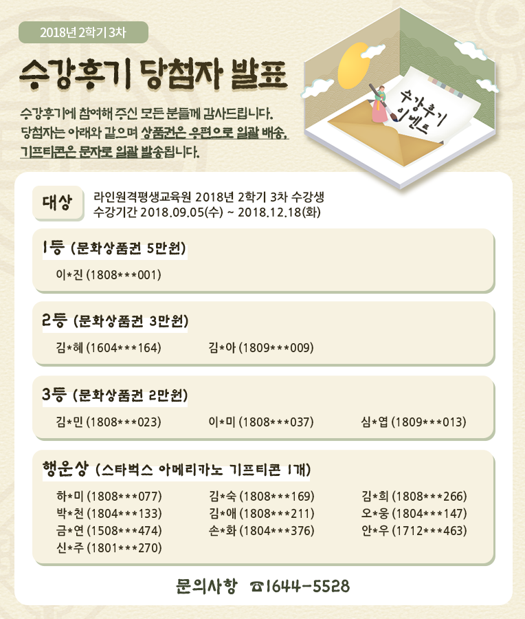 [¹ßÇ¥] 2018³â 2Çбâ(3Â÷) ¼ö°Èıâ À̺¥Æ® ´ç÷ÀÚ ¹ßÇ¥!!