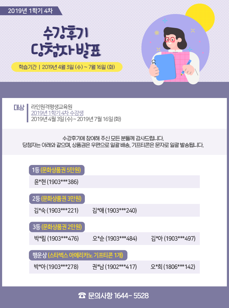 [¹ßÇ¥] 2019³â 1Çбâ(4Â÷) ¼ö°Èıâ À̺¥Æ® ´ç÷ÀÚ ¹ßÇ¥!!