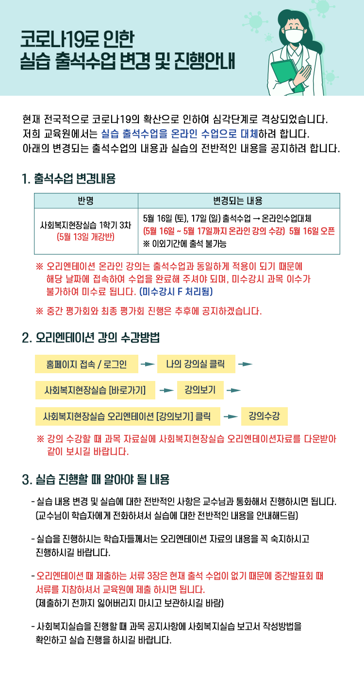 [¾È³»] 2020³â 1Çбâ 3Â÷ »çȸº¹ÁöÇöÀå½Ç½À Ãâ¼® ¼ö¾÷ º¯°æ ¾È³»ÀÔ´Ï´Ù.