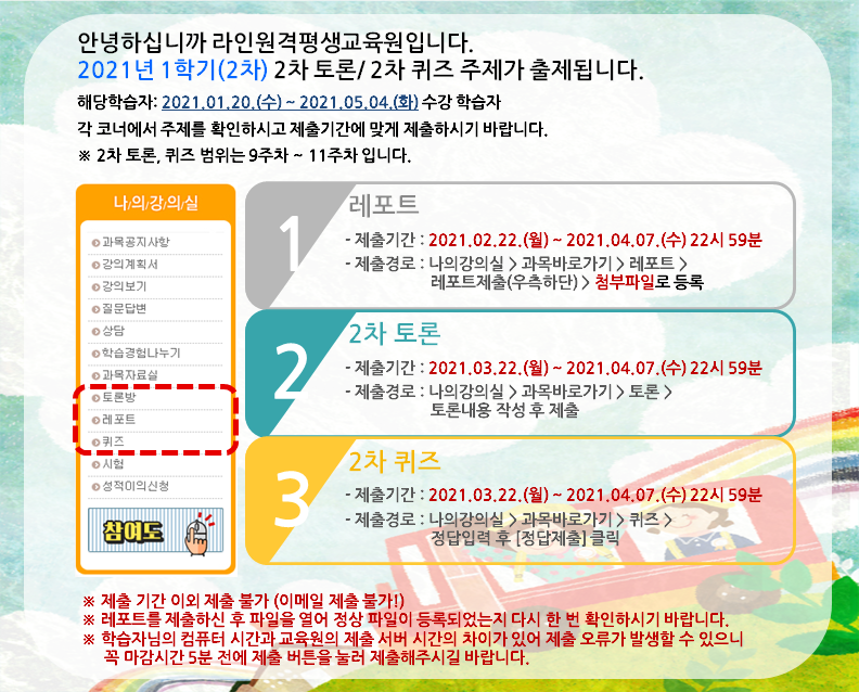 [2021³â 1Çбâ(2Â÷)] 2Â÷ÄûÁî, 2Â÷Åä·Ð ¾È³»ÀÔ´Ï´Ù.