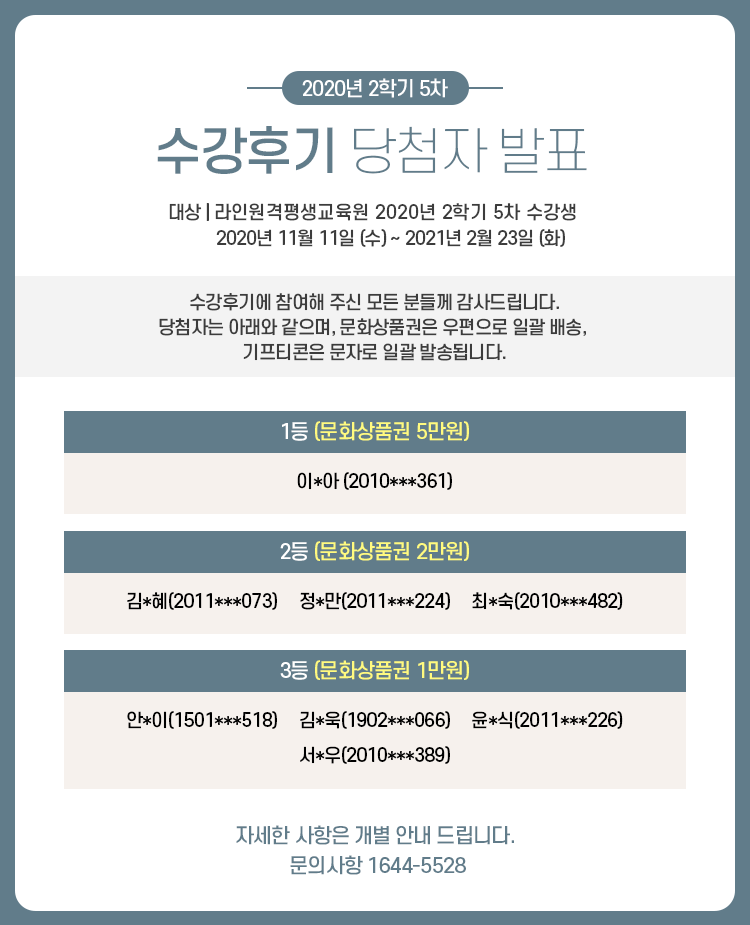 [¹ßÇ¥] 2020³â 2Çбâ(5Â÷) ¼ö°Èıâ À̺¥Æ® ´ç÷ÀÚ ¹ßÇ¥!!