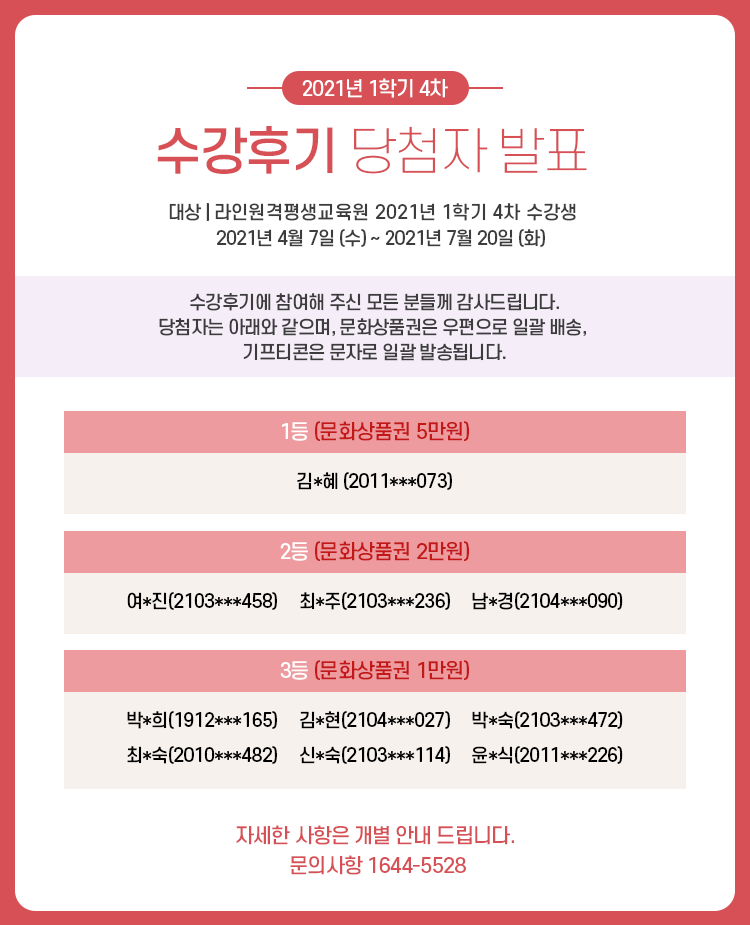 [¹ßÇ¥] 2021³â 1Çбâ(4Â÷) ¼ö°Èıâ À̺¥Æ® ´ç÷ÀÚ ¹ßÇ¥!!