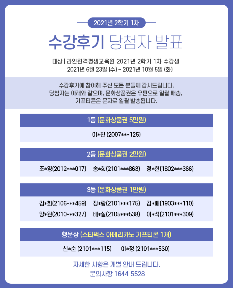 [¹ßÇ¥] 2021³â 2Çбâ(1Â÷) ¼ö°Èıâ À̺¥Æ® ´ç÷ÀÚ ¹ßÇ¥!!