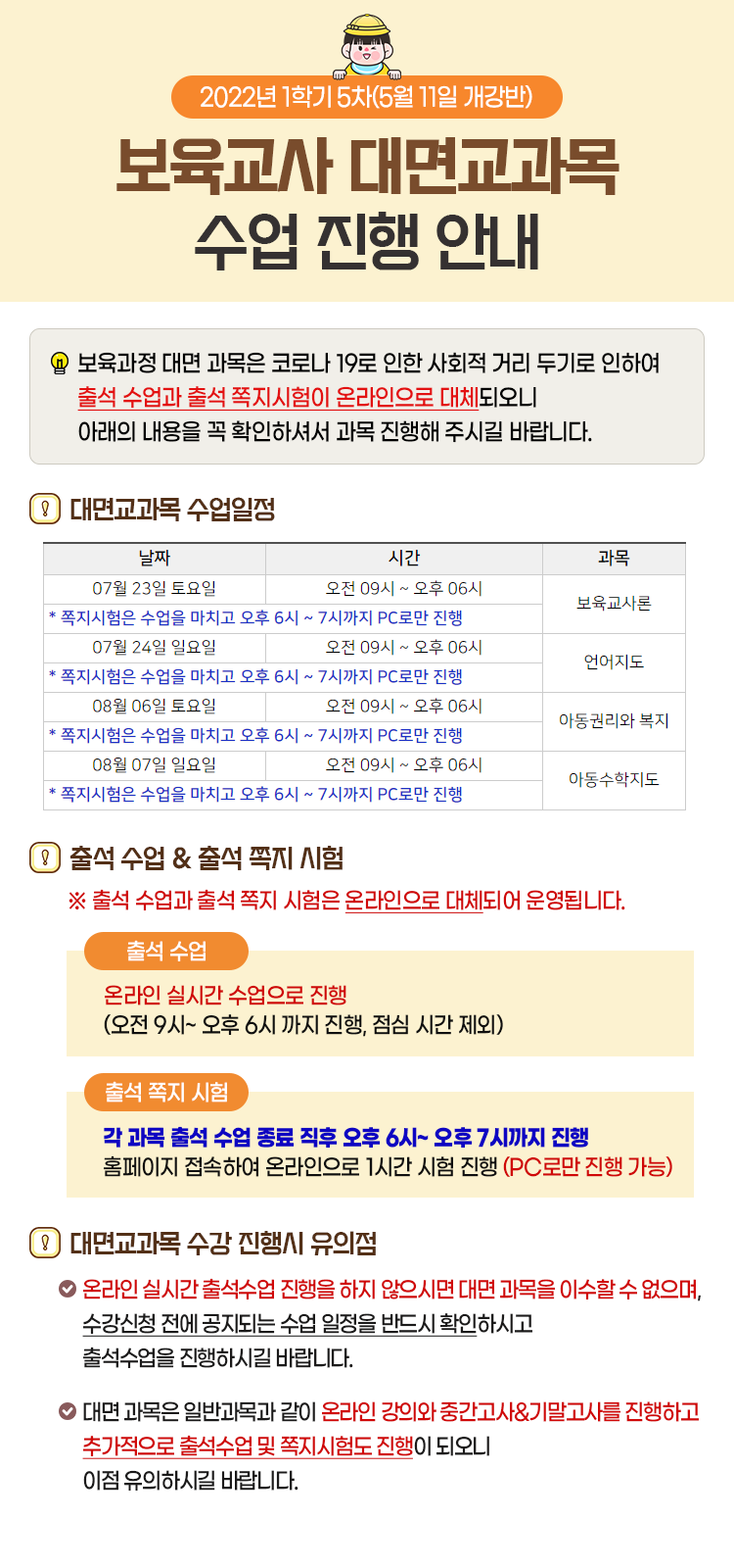 [¾È³»] 2022³â 1Çбâ 5Â÷ º¸À°±³»ç ´ë¸é±³°ú¸ñ ¼ö¾÷ÁøÇà ¾È³»ÀÔ´Ï´Ù.